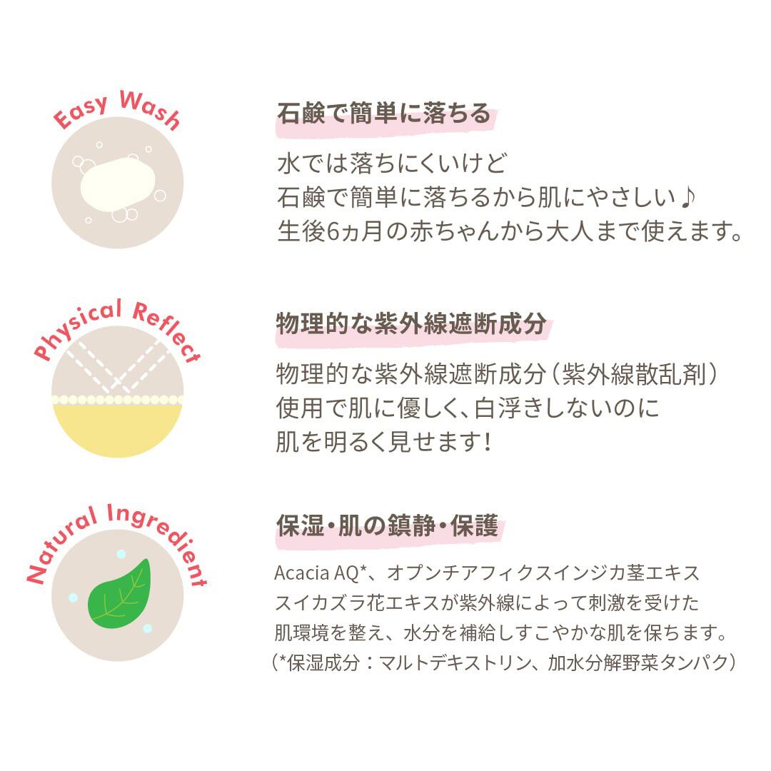高SPF・PA値ながら、肌への刺激が少ないノンナノ&ノンケミカル処方で楽しくしっかりUVカット。